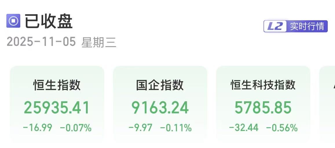 上证报中国证券网讯(刘禹希 记者 严晓菲)11月5日,港股三大指数表现低迷。截至收盘,恒生指数跌0.07%,报25935.41点;恒生国企指数跌0.11%,报9163.24点;恒生科技指数跌0.56%,报5785.85点。