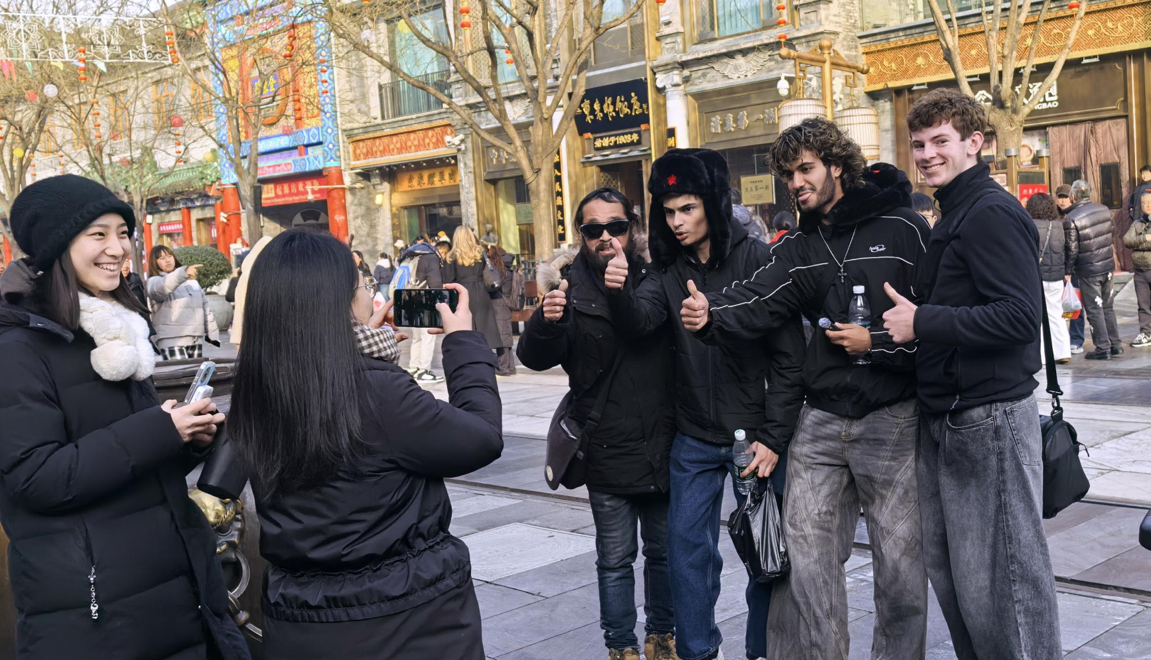 ↑游人在前门商业街上拍照留念(1月15日摄)。