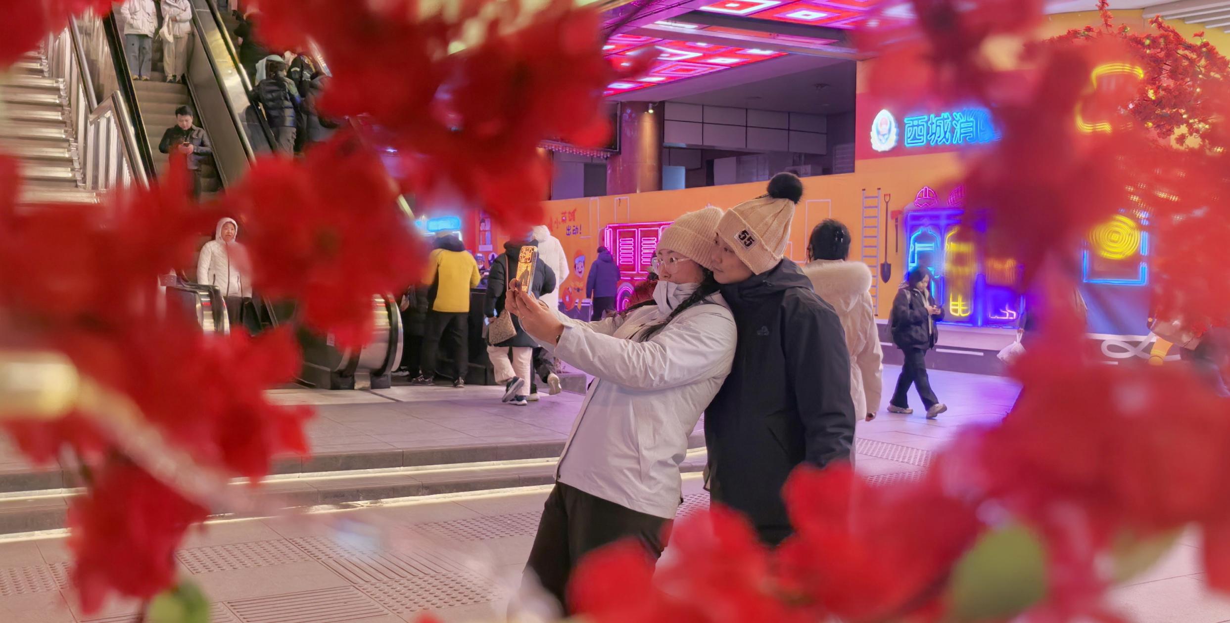 ↑市民在年味浓浓的西单商业街上自拍(1月16日摄)。