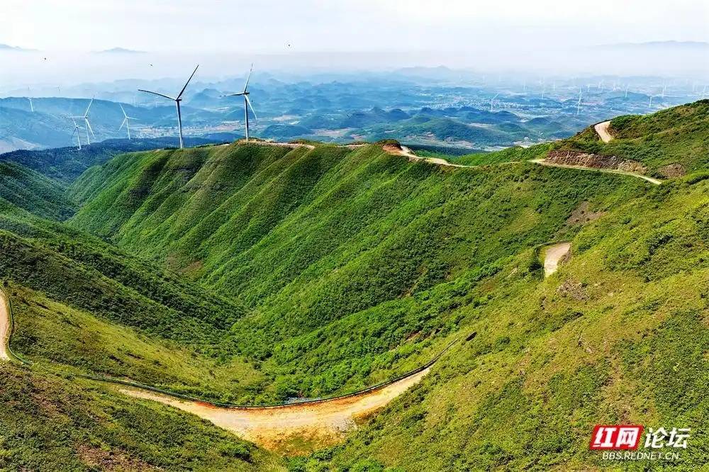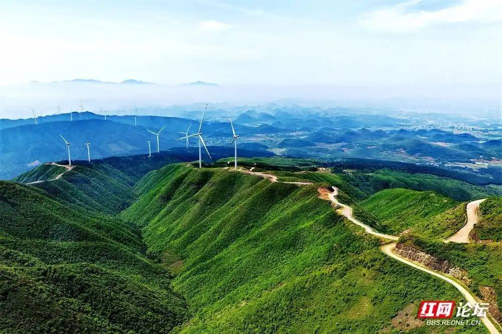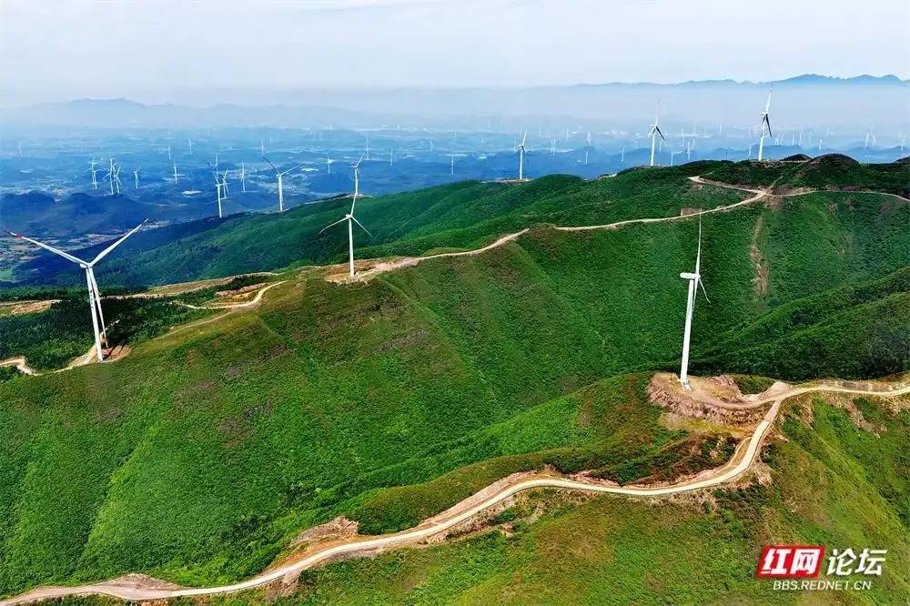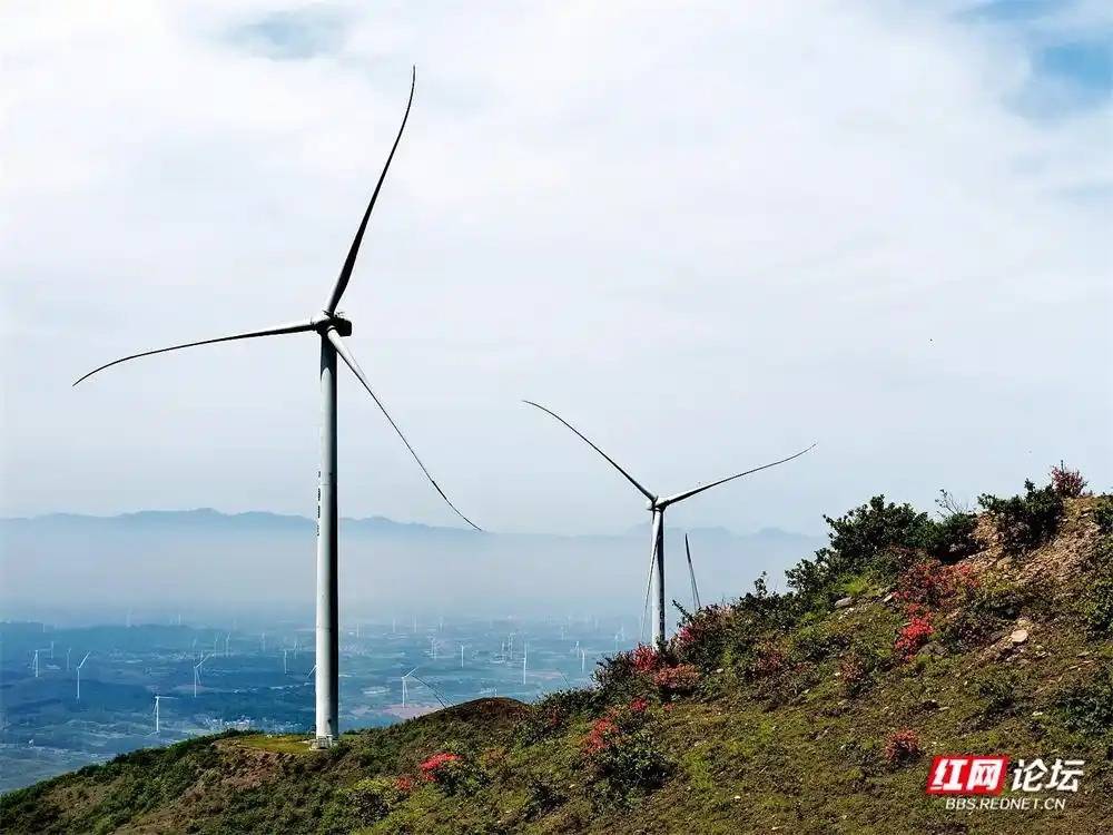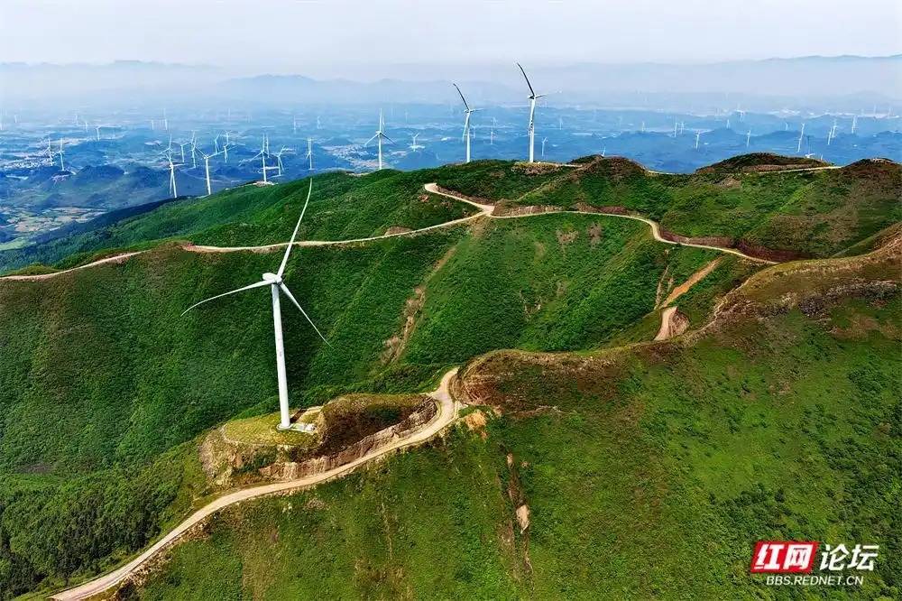 4月25日,在永州市江永县松柏瑶族乡的高峰山上,一座座风力发电机矗立在山脊之上股票配资论坛,巨大的叶片随风徐徐转动。