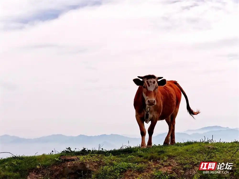 山间草甸上,几头黄牛和山羊悠闲地低头吃草,偶尔抬起头来,望一望远方。